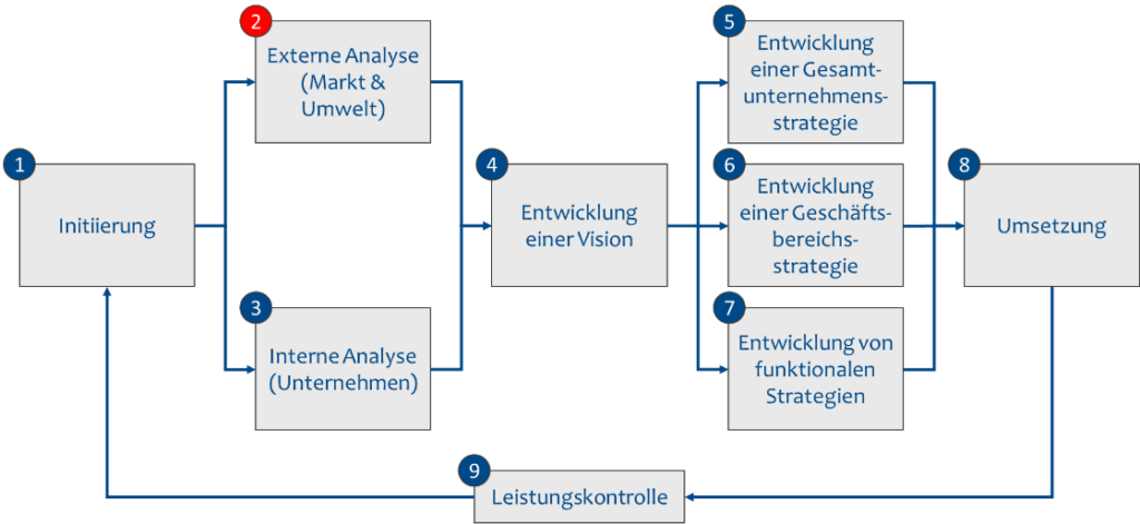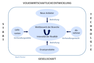 Im marktorientierten Ansatz bedingen die Branchenstruktur und das strategische Verhalten die Wettbewerbsvorteile des Unternehmens. Ebenso sind es externe Einflussfaktoren aus der externen Unternehmensumwelt (z.B. politische, wirtschaftliche oder technologische Einflussfaktoren), die im Zusammenhang mit dem Konkurrenzverhalten und der Branchenstruktur das eigene strategische Verhalten mitbestimmen. Zielsetzung muss so die permanente Analyse der globalen Umwelt sowie der Wettbewerbssituation und der Entwicklung der gesamten Branche sein. Ein einschlägiges und anerkanntes Instrument ist die Branchenstrukturanalyse nach Porter (Porters Five Forces), welche in der nachfolgenden Abbildung dargestellt wird.
