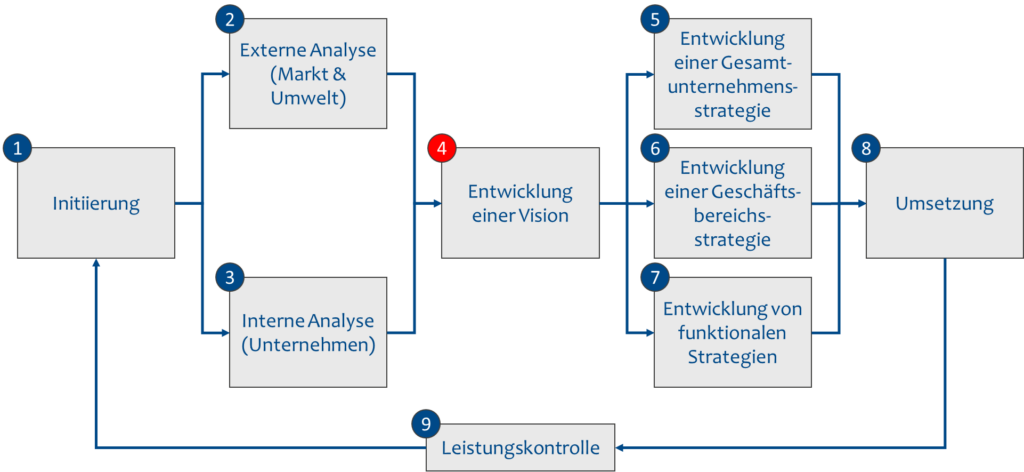 Auf der Basis der vorgenommenen internen sowie externen Analyse werden nun die langfristigen Ziele des Unternehmens eruiert. Im Vergleich zur Initiierungsphase geht es nun darum, von den grundsätzlichen obersten Unternehmenszielen anhand der Analyseergebnisse zu konkreteren langfristigen Zielen zu gelangen. Diese werden auf Gesamtunternehmensebene gebildet und bedürfen einer Konkretisierung durch die Entwicklung eines Mission Statements (primäre Werte, Zweck des Unternehmens), einer Unternehmensvision und darauf aufbauend eines verbindlichen formalisierten Leitbildes.