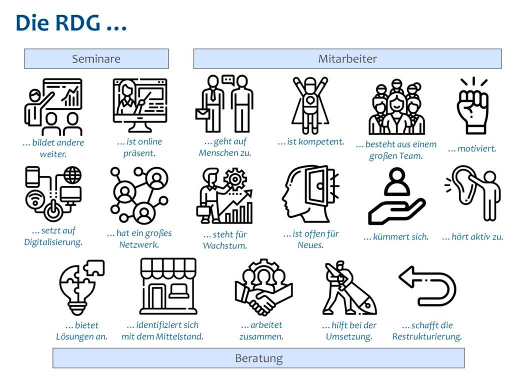 Als Beispiel möchten wir Ihnen gerne unser eigenes Leitbild vorstellen. Dieses beinhaltet 17 Eigenschaften, teilweise allgemeingültig und teilweise aufgeteilt auf die drei Säulen Seminare, Mitarbeiter sowie Beratung.